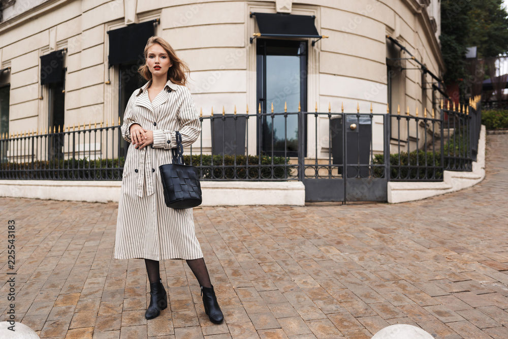 Young pensive woman in striped trench coat with black handbag thoughtfully looking in camera while walking around cozy city street