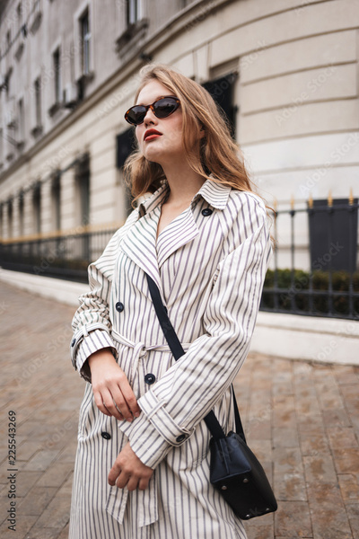 Young pensive woman in striped trench coat with little black cross bag thoughtfully looking aside while walking around cozy city street