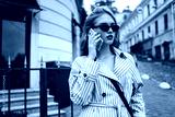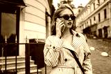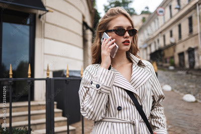 Young pretty woman in striped trench coat with little black cross bag talking on cellphone dreamily looking aside while walking around cozy city street