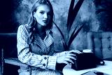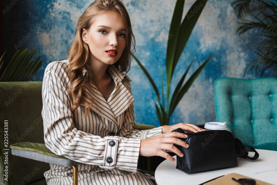 Young pretty woman with wavy hair in striped trench coat thoughtfully looking in camera holding little black handbag while spending time in modern cafe