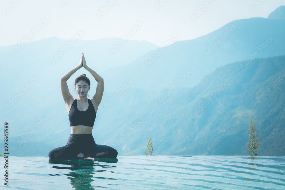 Beautiful Attractive Asian woman practice yoga Lotus pose on the pool above the Mountain peak in the morning in front of beautiful nature views in SAPA vietnam,Feel so comfortable and relax in holiday