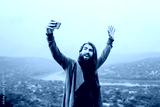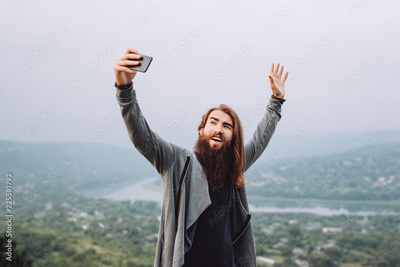 Young cheerful bearded guy makes selfie.Against the background of a young man a beautiful autumn landscape.Cheerful guy holds hands up.