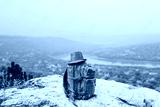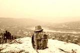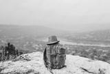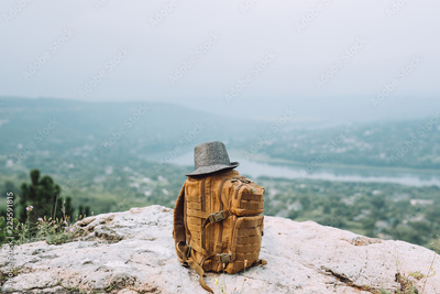 On a high rock lies a stylish large brown backpack.There is a gray hat on the backpack.On the background of items beautiful green summer landscape.