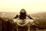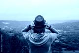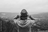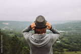 Young Tourist looks with admiration at the beautiful highlands.The guy has long gorgeous hair.On his head a fashionable, gray hat.