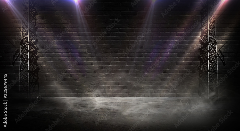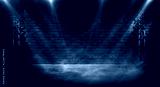 Empty scene of a show with lanterns and concrete floor, blue abstract background with bokeh, lights, rays