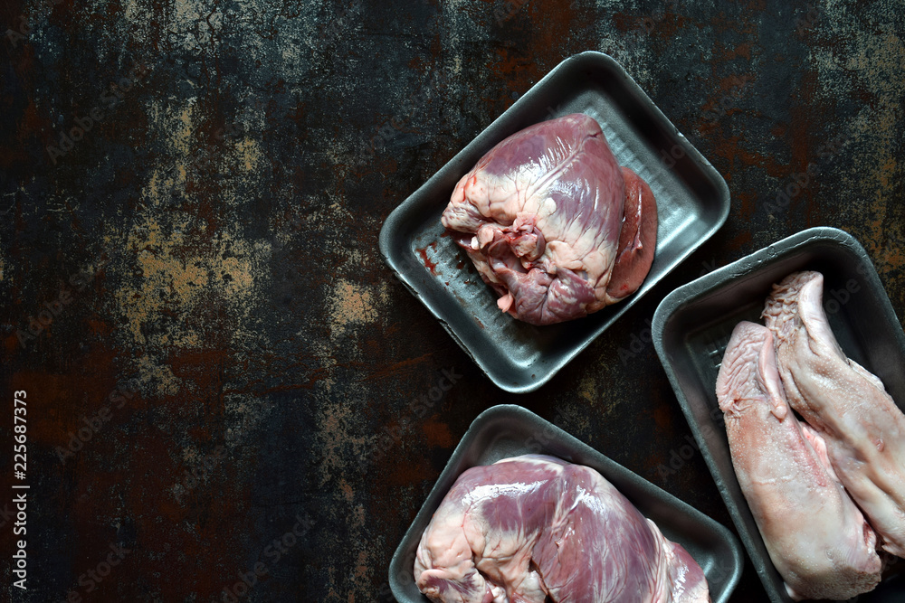 Heart and tongue before cooking on black background. Raw meat. Offal
