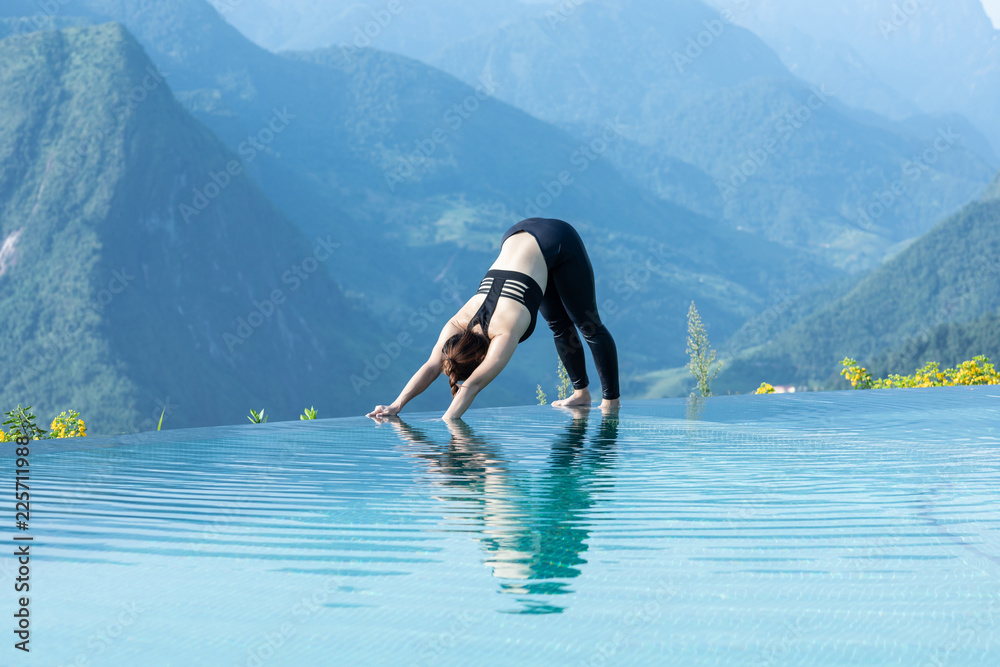 Beautiful Attractive Asian woman practice yoga Downward Facing Dog or Adho Mukha Svanasana pose on the pool above the Mountain peak in the morning in front of beautiful nature views in SAPA vietnam