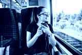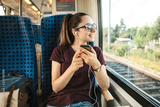 A young girl listens to a music or podcast while traveling in a train.