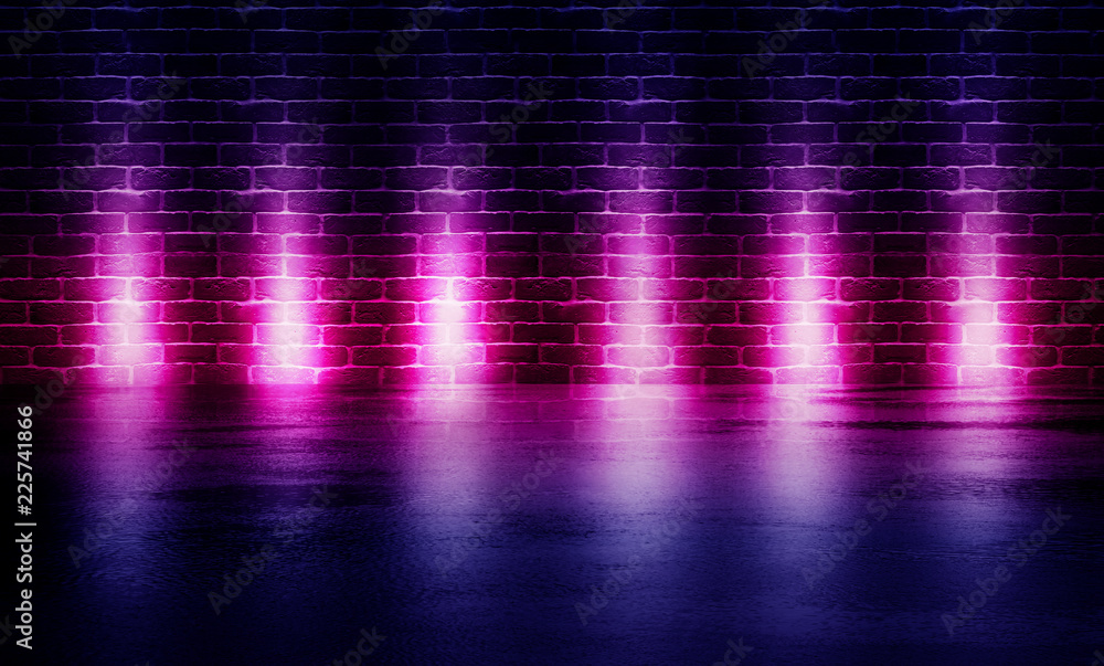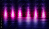 Background of empty room with brick wall and concrete floor. Smoke, fog, neon light