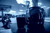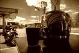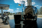 A biker at a gas station drinks coffee