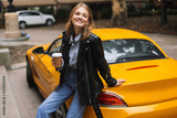 Pretty cheerful girl in leather jacket leaning on yellow sport car holding cup of coffee to go in hand happily looking aside on city street