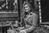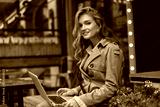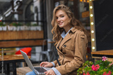 Beautiful smiling girl in trench coat dreamily looking in camera sitting with laptop on knees while spending time outdoor at the cafe terrace