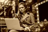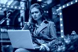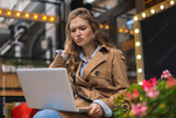Young upset woman in trench coat working on laptop while spending time outdoor at the cafe terrace