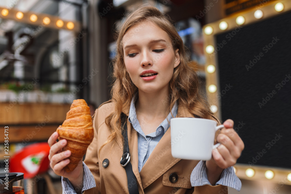 Portrait of young woman in trench coat dreamily looking aside holding croissant and white cup in hands while spending time outdoor at cozy cafe terrace