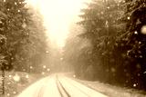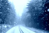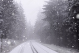 verschneite straße mit nebel im wald