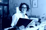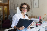 Young beautiful smiling girl with short curly hair in eyeglasses