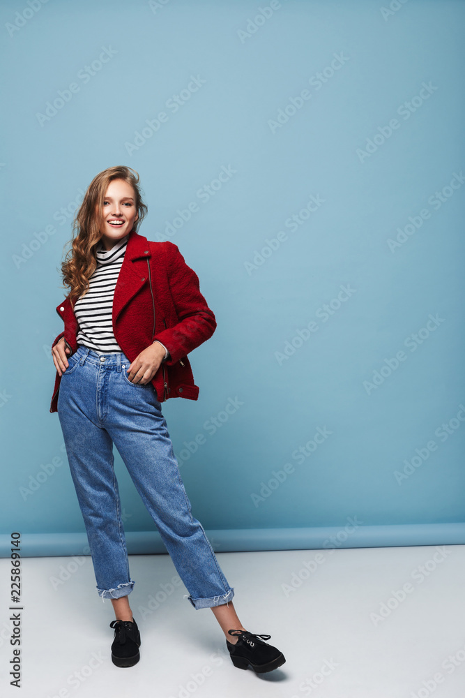 Young happy woman with wavy hair in red jacket and jeans joyfully looking in camera holding hands in pockets over blue background isolated