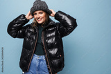 Young cheerful woman in knitted hat and black down jacket happily looking in camera over blue background isolated