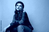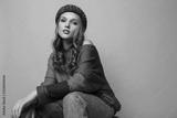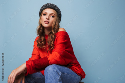 Young beautiful lady with wavy hair in hat and red sweater dreamily looking in camera over blue background isolated