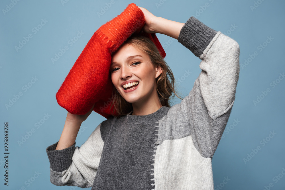 Beautiful joyful girl with wavy hair in gray sweater holding red sweater above head happily looking in camera over blue background isolated