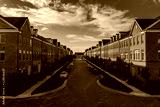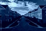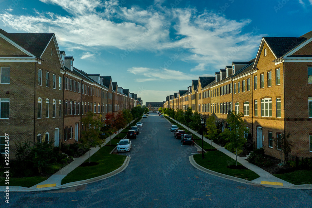 Aerial view of a typical American middle class street with brick townhouses and blue sky