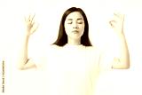 Zen sign. Calm asian girl in blank white t shirt isolated on template background. Copy space.