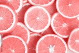 Pink citrus fruits - cuts, slices, halves. Closeup of pink fruits, oranges, grapefruits.