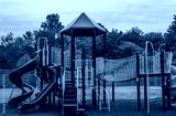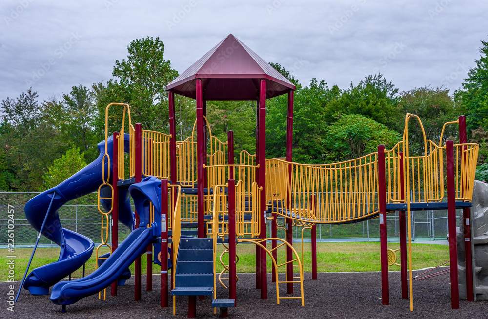 Yellow blue, red set with slide on an American playground in a middle class neighborhood