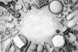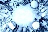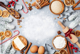 Ingredients for cooking christmas baking decorated with fir tree. Flour, brown sugar, eggs and spices top view. Bakery background.