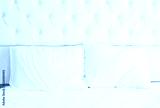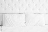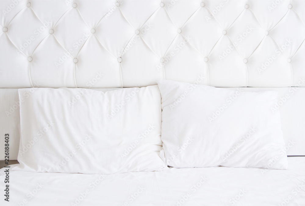 White bedroom interior design with bed and blank pillows. Bedding relax time. Copy space