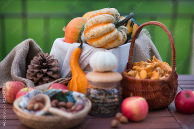 Decoration for halloween with pumpkins, nuts and flowers on the table in autumn