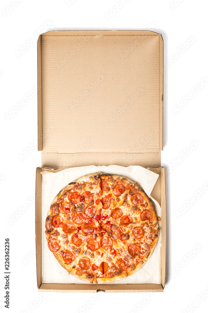 Fresh tasty pepperoni pizza in opened box isolated on white background. Top view