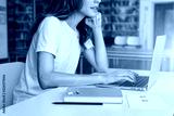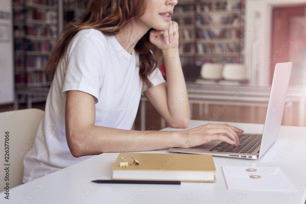 Young woman long hair analyst working at co-working office on laptop, bookshelf behind. Businesswoman learning alone in library.