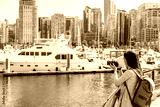 Vancouver Canada tourist woman taking picture with camera at Coal Harbour on summer holidays in canadian city. Urban lifestyle.