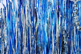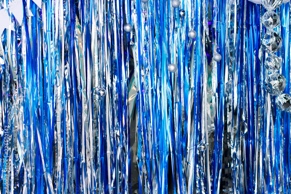 colorful shiny streamers background, blue and silver serpentine decoration, serpentine shiny glitter background, carnival party serpentine decoration with confetti, flags and silver christmas balls