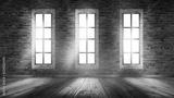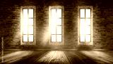 A brick wall in an empty room, large wooden windows, a magical light and the rays of the sun.