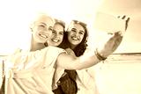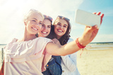 summer vacation, holidays, travel, technology and people concept- group of smiling young women taking sulfide with smartphone on beach