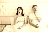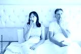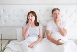 Tired yawn middle age couple in bed. Family life and healthy relationships. Health care and morning concept. Copy space