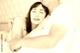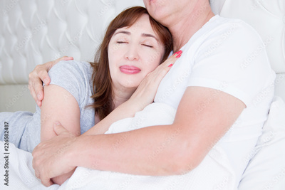 Happy middle age family couple in bed. White interior. Love and healthy relationships. Husband and wife portrait. Cropped image