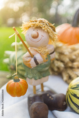 Decorations on the stump in the garden for halloween with asters and pumpkins