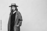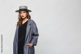 Young beautiful woman with wavy hair in hat and cloak holding hands in pockets dreamily looking in camera over gray background isolated