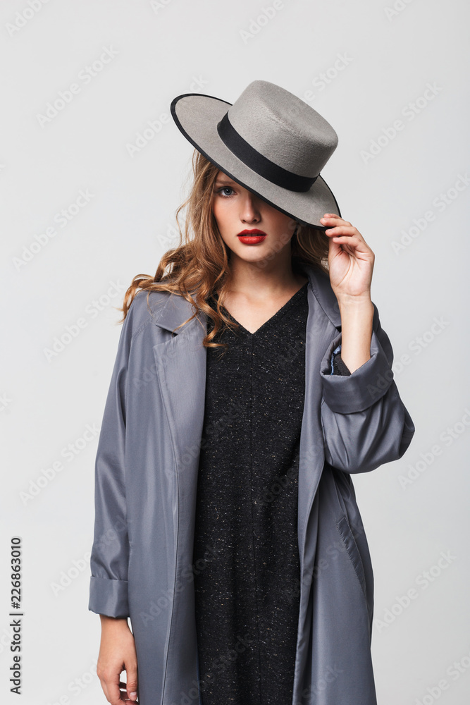 Young attractive woman with wavy hair in cloak covering eye with hat thoughtfully looking in camera over gray background isolated