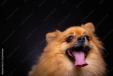Lovely Pomeranian dog look at owner for asking, begging snack, food. Cute dog feel hot. Charming doggy has beautiful brown hair or brown fur. It look innocent and adorable. black background copy space
