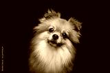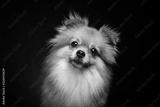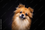 Lovely Pomeranian dog looks at camera on black background. Cute dog get curious something. Charming doggy has beautiful brown hair or brown fur. It looks innocent. It has good health and look adorable