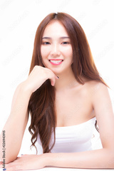 Gorgeous woman feels happy with smile. Attractive beautiful woman wear tube top. Charming beautiful young woman has nice skin and perfect body. Glamour girl take care herself well. isolated on white