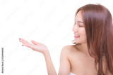 Charming beautiful young woman looks at hand or copy space. Attractive beautiful girl admire, love or like product. Gorgeous woman showing goods, product. It use for advertisement. isolated on white