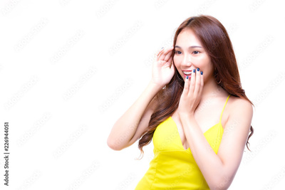 Charming beautiful woman looks copy space. Attractive beautiful woman gets surprised, shocked of product, brand or goods. Glamour sexy woman feels happy when seeing it. use for commercial, advertising