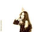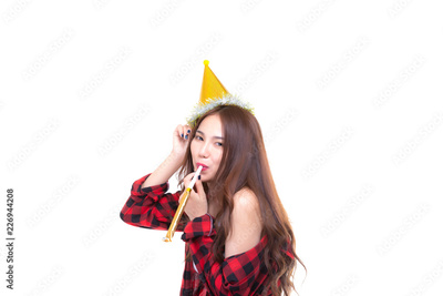 Attractive beautiful woman blowing party whistle and wears party hat for celebrating new year, birthday, party or festival. Charming beautiful sexy woman get enjoy, happy. isolated on white copy space