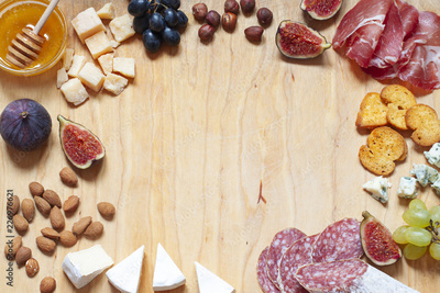 Antipasti food white flat lay with nuts, honey, cured meat, salami, cheeses, grapes and figs on the wooden board. Top view snack concept frame. Copy space.
