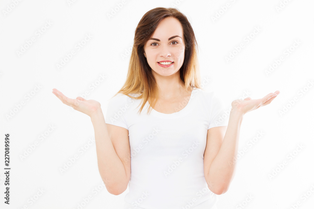 Caucasian girl in tshirt isolated on white background. Copy space. European young woman. Mock up. Summer clothes blank template white t shirt.